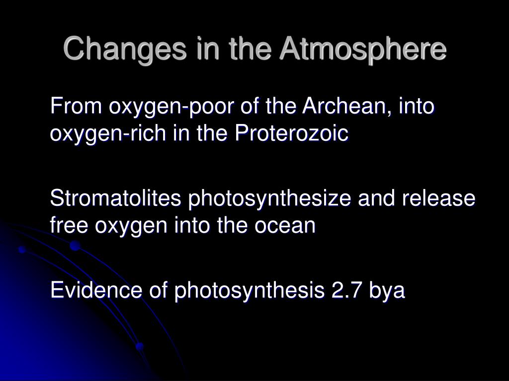 Changes in the Atmosphere From oxygen-poor of the Archean, into oxygen-rich in the Proterozoic Stromatolites photosynthesize and release free oxygen into the ocean Evidence of photosynthesis 2.7 bya