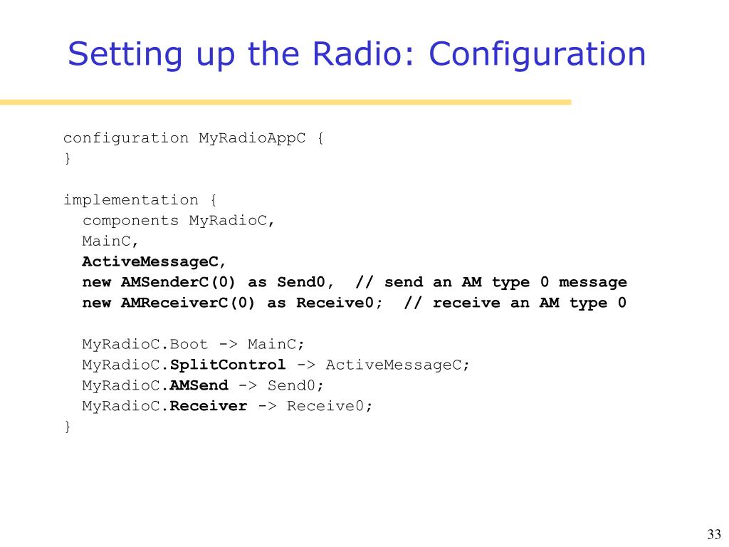 Setting up the Radio: Configuration configuration MyRadioAppC { } implementation { components MyRadioC, MainC, ActiveMessageC, new AMSenderC(0) as Send0, // send an AM type 0 message new AMReceiverC(0) as Receive0; // receive an AM type 0 }