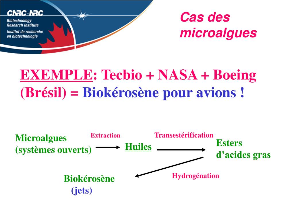 Cas des microalgues EXEMPLE: Tecbio + NASA + Boeing (Brésil) = Biokérosène pour avions ! Transestérification Extraction Microalgues (systèmes ouverts) Esters d’acides gras Huiles Hydrogénation Biokérosène (jets)