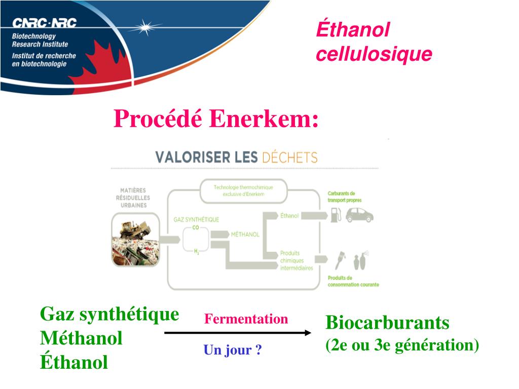 Éthanol cellulosique Procédé Enerkem: Gaz synthétique Méthanol Éthanol Fermentation Biocarburants (2e ou 3e génération) Un jour ?