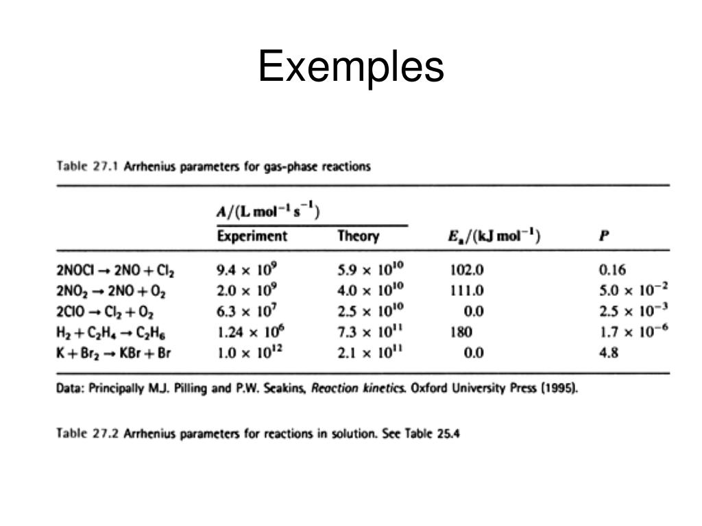 Fréquence de collisions bimoléculaires Constante de vitesse d’une réaction bimoléculaire A+B=>C Vitesse de réaction: avec (facteur pré-exponentiel) ARRHÉNIUS