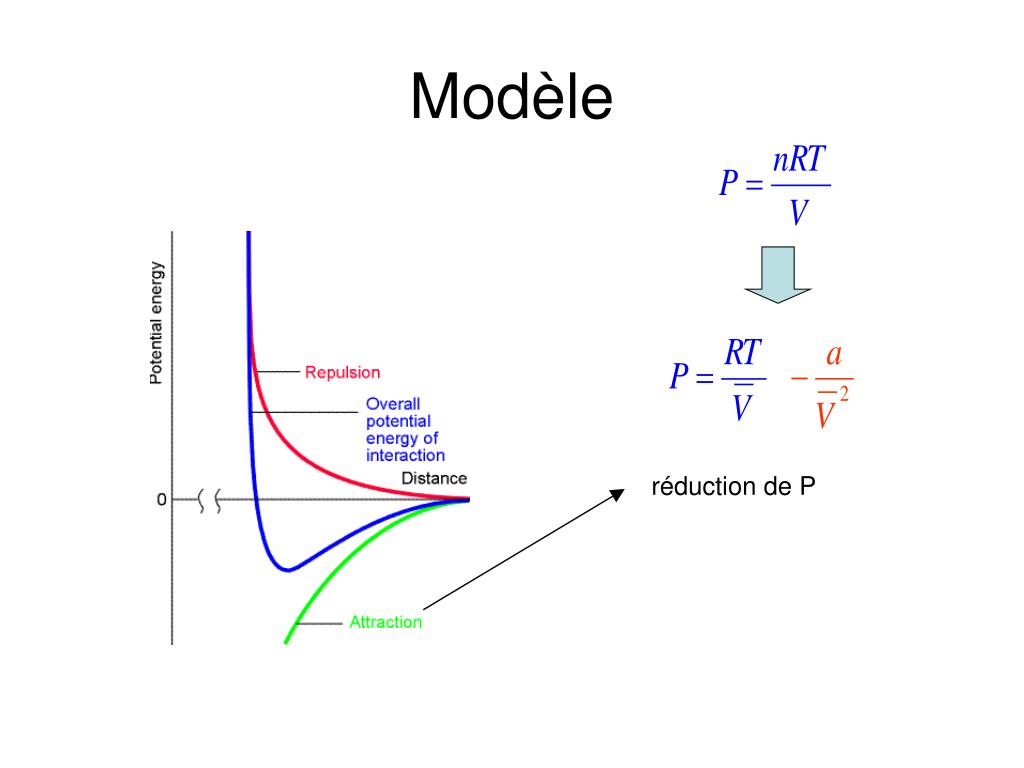 Gaz de Van der Waals. Modèle. Modèle. réduction de P. Modèle. réduction de P. Modèle. réduction de P:. Modèle. réduction de P:. volume (molaire ) d’exclusion. Modèle. réduction de P:. coefficients de Van der Waals. Coefficients de Van der Waals. Gaz parfait vs. gaz de VdW.