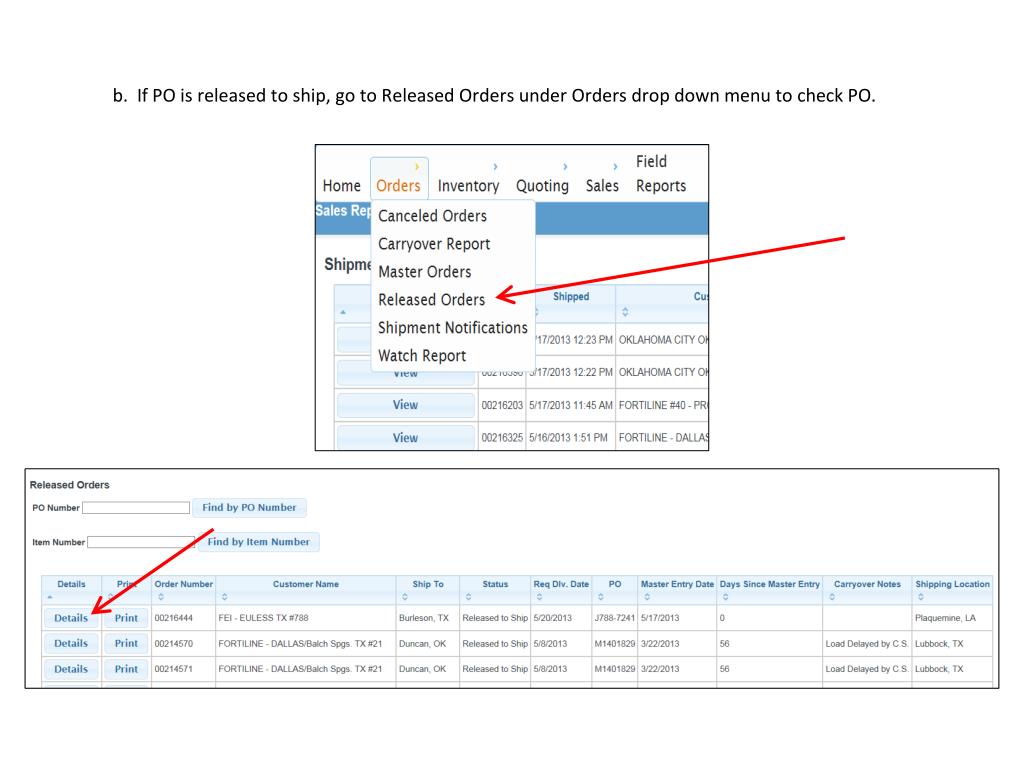 2. Check that order has been entered into Rep Portal correctly. Check customer, PO#, ship to, precall, deliverydate, pipe items and any special notes or instructions. a. If PO is hold for release, go to Master Orders under Orders drop down menu to check PO.