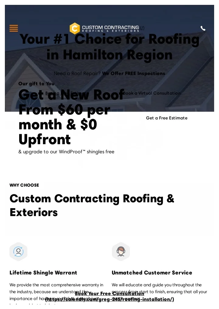 (/) Your #1 Choice for Roofing in Hamilton Region Need a Roof Repair? We Offer FREE Inspections Our gift to You Get a New Roof From $60 per month & $0 Upfront & upgrade to our WindProof™ shingles free Book a Free Estimate Book a Virtual Consultation Get a Free Estimate WHY CHOOSE Custom Contracting Roofing & Exteriors Lifetime Shingle Warrant Unmatched Customer Service We provide the most comprehensive warranty in We will educate and guide you throughout the the industry, because we understand the process from start to finish, ensuring that all your Book Your Free Consultation importance of having a roof that doesn’t just (https://calendly.com/greg-245/roofing-installation/) needs are met. l k d b t t l l t