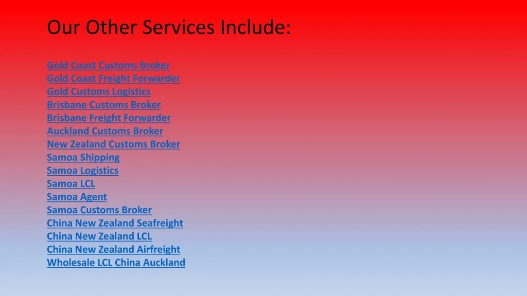 Our Other Services Include: Gold Coast Customs Broker Gold Coast Freight Forwarder Gold Customs Logistics Brisbane Customs Broker Brisbane Freight Forwarder Auckland Customs Broker New Zealand Customs Broker Samoa Shipping Samoa Logistics Samoa LCL Samoa Agent Samoa Customs Broker China New Zealand Seafreight China New Zealand LCL China New Zealand Airfreight Wholesale LCL China Auckland