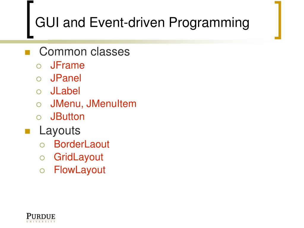 GUI and Event-driven Programming • Common classes • JFrame • JPanel • JLabel • JMenu, JMenuItem • JButton • Layouts • BorderLaout • GridLayout • FlowLayout