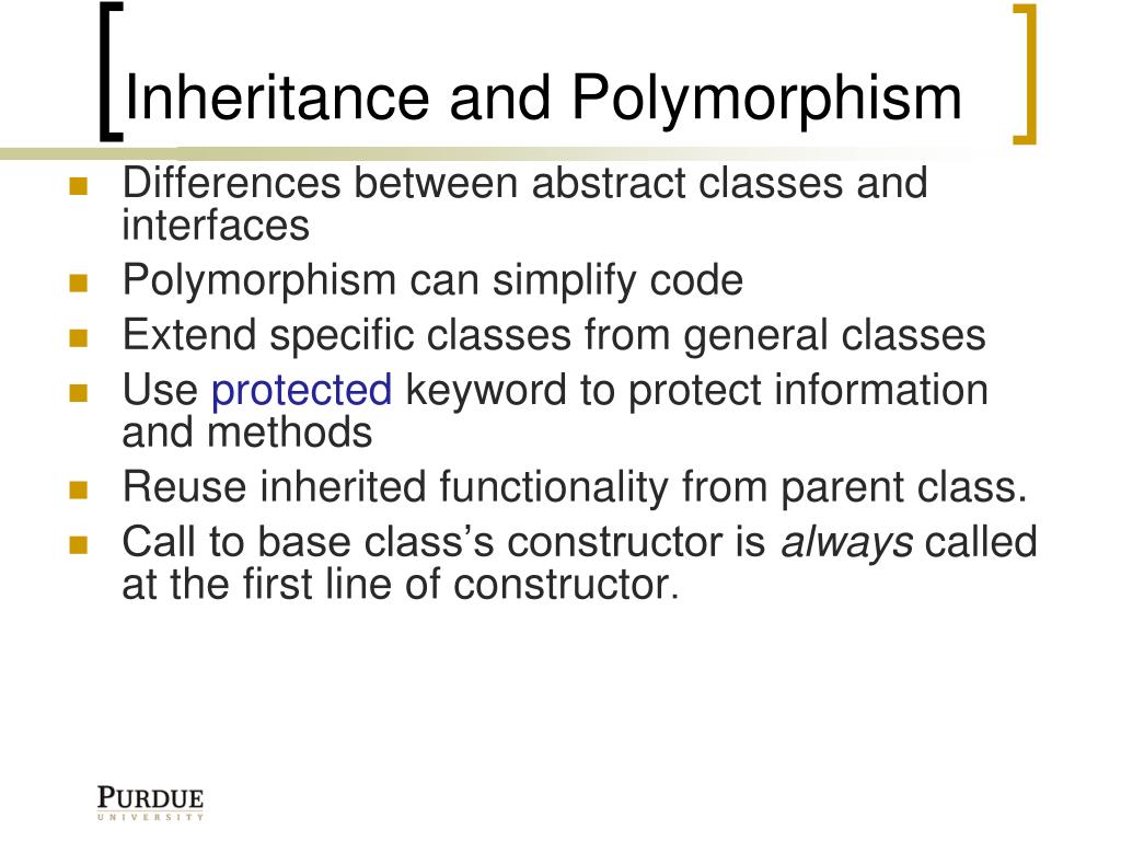 Inheritance and Polymorphism • Differences between abstract classes and interfaces • Polymorphism can simplify code • Extend specific classes from general classes • Use protected keyword to protect information and methods • Reuse inherited functionality from parent class. • Call to base class’s constructor is always called at the first line of constructor.