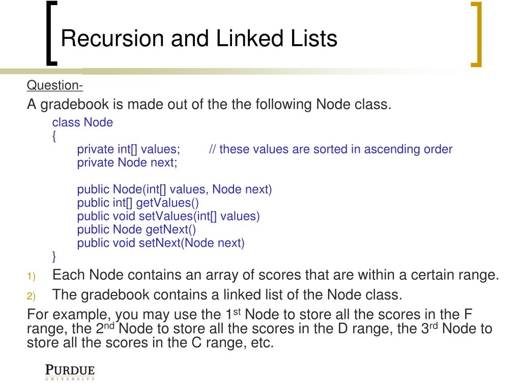 Recursion and Linked Lists Question- A gradebook is made out of the the following Node class. class Node { private int[] values; // these values are sorted in ascending order private Node next; public Node(int[] values, Node next) public int[] getValues() public void setValues(int[] values) public Node getNext() public void setNext(Node next) } • Each Node contains an array of scores that are within a certain range. • The gradebook contains a linked list of the Node class. For example, you may use the 1st Node to store all the scores in the F range, the 2nd Node to store all the scores in the D range, the 3rd Node to store all the scores in the C range, etc.