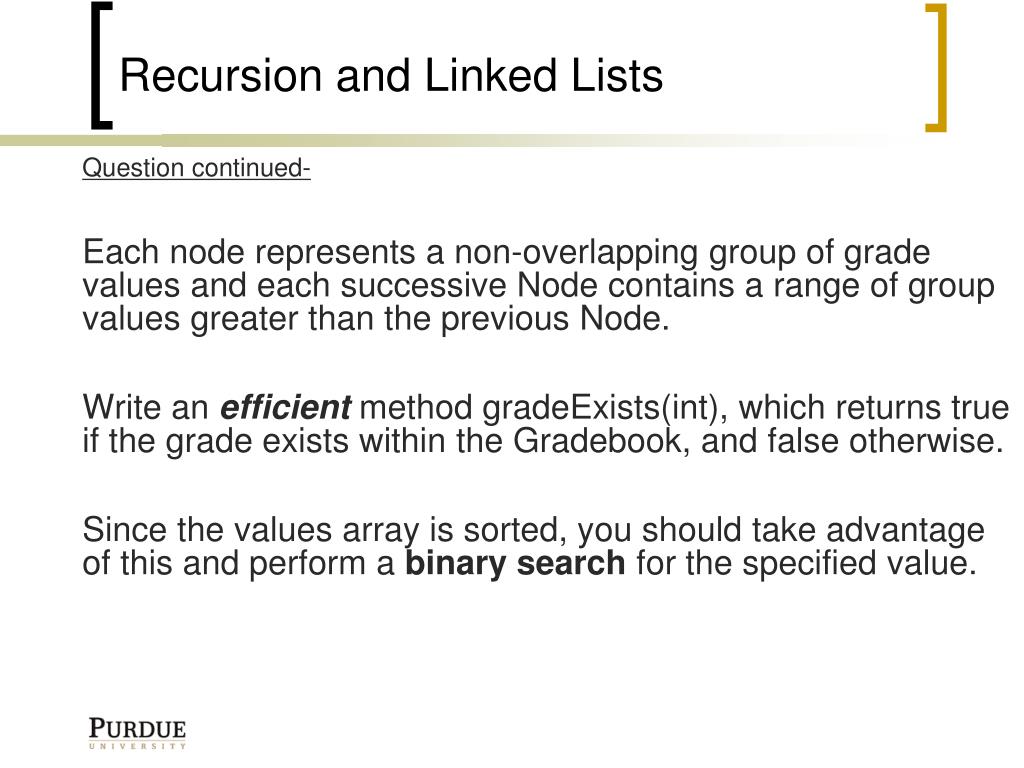 Recursion and Linked Lists Question continued- Each node represents a non-overlapping group of grade values and each successive Node contains a range of group values greater than the previous Node. Write an efficient method gradeExists(int), which returns true if the grade exists within the Gradebook, and false otherwise. Since the values array is sorted, you should take advantage of this and perform a binary search for the specified value.