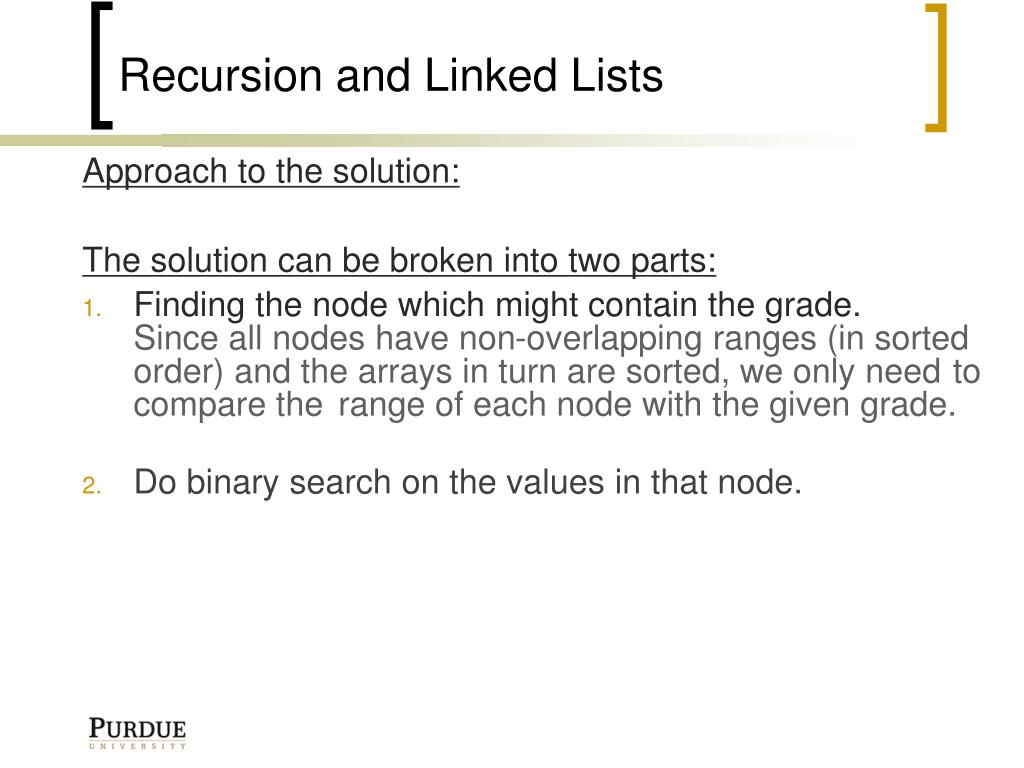 Recursion and Linked Lists Approach to the solution: The solution can be broken into two parts: • Finding the node which might contain the grade.Since all nodes have non-overlapping ranges (in sorted order) and the arrays in turn are sorted, we only need to compare the range of each node with the given grade. • Do binary search on the values in that node.