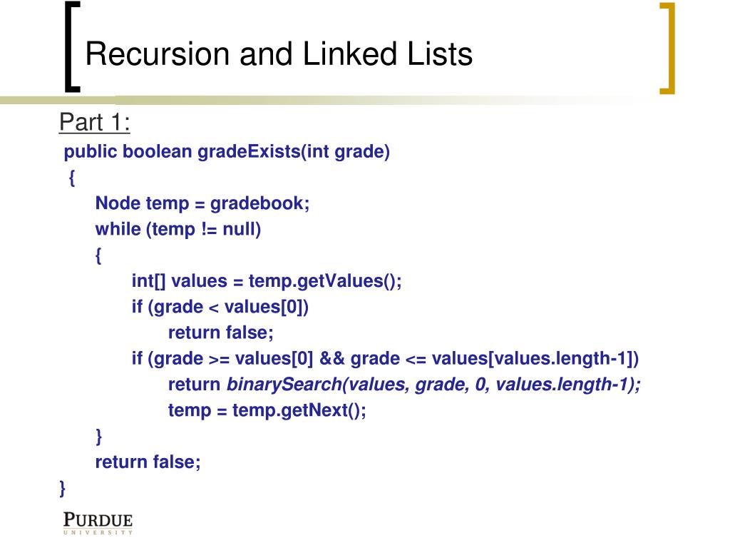 Recursion and Linked Lists Part 1: public booleangradeExists(int grade) { Node temp = gradebook; while (temp != null) { int[] values = temp.getValues(); if (grade < values[0]) return false; if (grade >= values[0] && grade <= values[values.length-1]) return binarySearch(values, grade, 0, values.length-1); temp = temp.getNext(); } return false; }