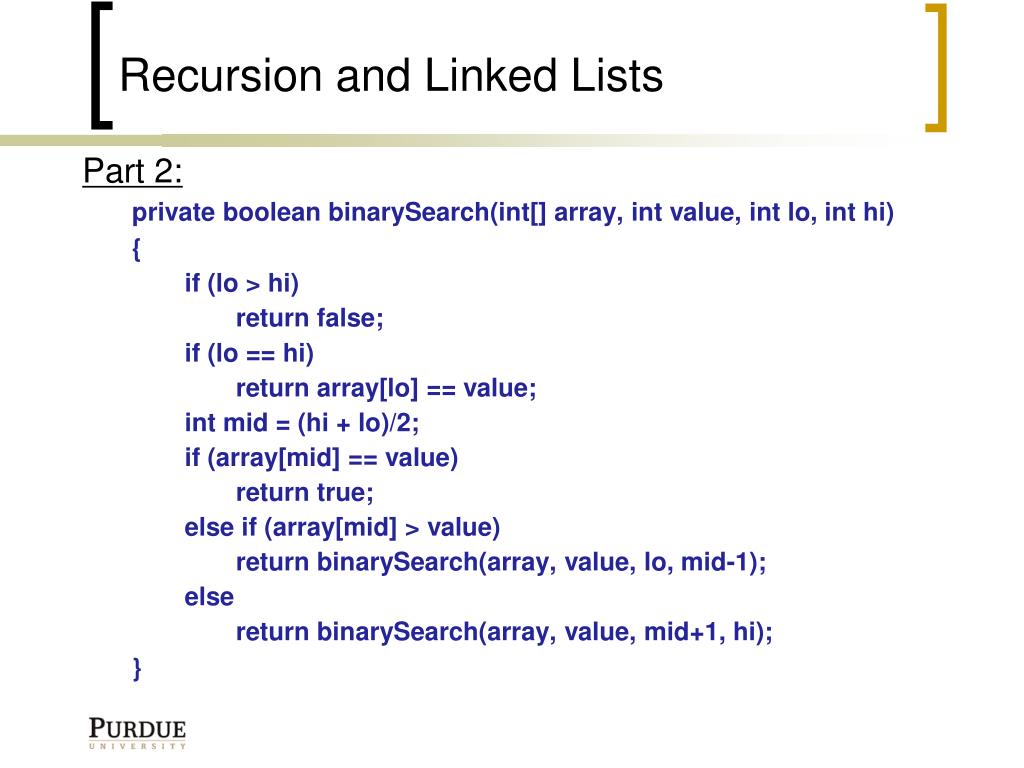 Recursion and Linked Lists Part 2: private booleanbinarySearch(int[] array, int value, int lo, int hi) { if (lo > hi) return false; if (lo == hi) return array[lo] == value; int mid = (hi + lo)/2; if (array[mid] == value) return true; else if (array[mid] > value) return binarySearch(array, value, lo, mid-1); else return binarySearch(array, value, mid+1, hi); }