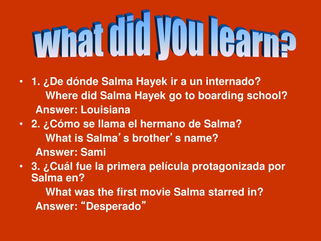 What did you learn? • 1. ¿De dónde Salma Hayek ir a un internado? Where did Salma Hayek go to boarding school? Answer: Louisiana • 2. ¿Cómo se llama el hermano de Salma? What is Salma’s brother’s name? Answer: Sami • 3. ¿Cuál fue la primera película protagonizada por Salma en? What was the first movie Salma starred in? Answer: “Desperado”