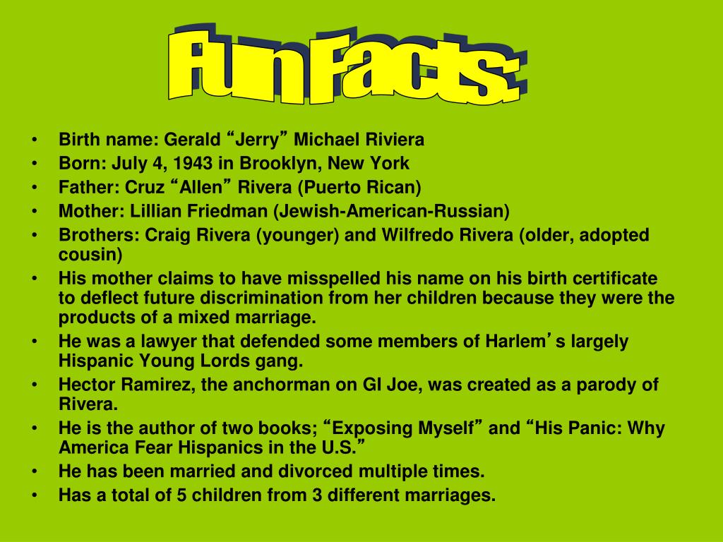 Fun Facts: • Birth name: Gerald “Jerry” Michael Riviera • Born: July 4, 1943 in Brooklyn, New York • Father: Cruz “Allen” Rivera (Puerto Rican) • Mother: Lillian Friedman (Jewish-American-Russian) • Brothers: Craig Rivera (younger) and Wilfredo Rivera (older, adopted cousin) • His mother claims to have misspelled his name on his birth certificate to deflect future discrimination from her children because they were the products of a mixed marriage. • He was a lawyer that defended some members of Harlem’s largely Hispanic Young Lords gang. • Hector Ramirez, the anchorman on GI Joe, was created as a parody of Rivera. • He is the author of two books; “Exposing Myself” and “His Panic: Why America Fear Hispanics in the U.S.” • He has been married and divorced multiple times. • Has a total of 5 children from 3 different marriages.