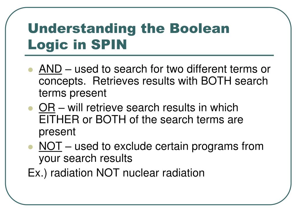 Understanding the Boolean Logic in SPIN • AND – used to search for two different terms or concepts. Retrieves results with BOTH search terms present • OR – will retrieve search results in which EITHER or BOTH of the search terms are present • NOT – used to exclude certain programs from your search results Ex.) radiation NOT nuclear radiation
