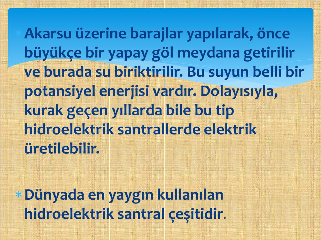 Akarsu üzerine barajlar yapılarak, önce büyükçe bir yapay göl meydana getirilir ve burada su biriktirilir. Bu suyun belli bir potansiyel enerjisi vardır. Dolayısıyla, kurak geçen yıllarda bile bu tip hidroelektrik santrallerde elektrik üretilebilir. Dünyada en yaygın kullanılan hidroelektrik santral çeşitidir.