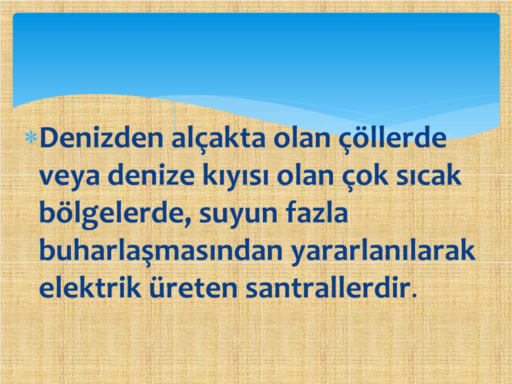 Denizden alçakta olan çöllerde veya denize kıyısı olan çok sıcak bölgelerde, suyun fazla buharlaşmasından yararlanılarak elektrik üreten santrallerdir.