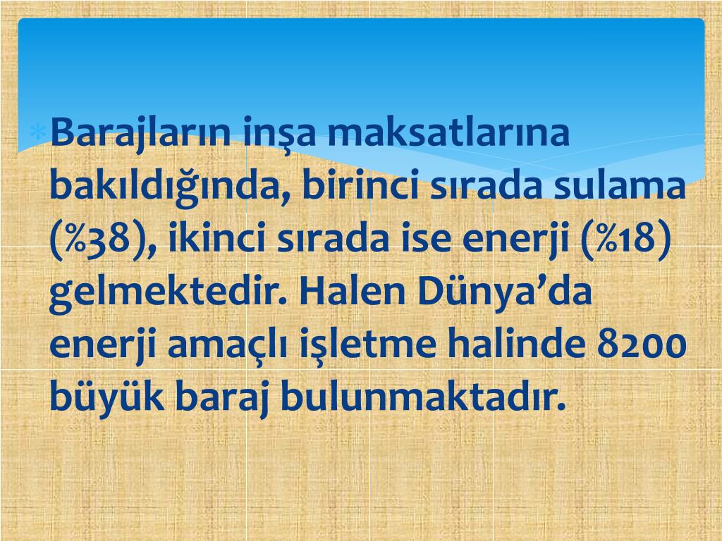 Barajların inşa maksatlarına bakıldığında, birinci sırada sulama (%38), ikinci sırada ise enerji (%18) gelmektedir. Halen Dünya’da enerji amaçlı işletme halinde 8200 büyük baraj bulunmaktadır.