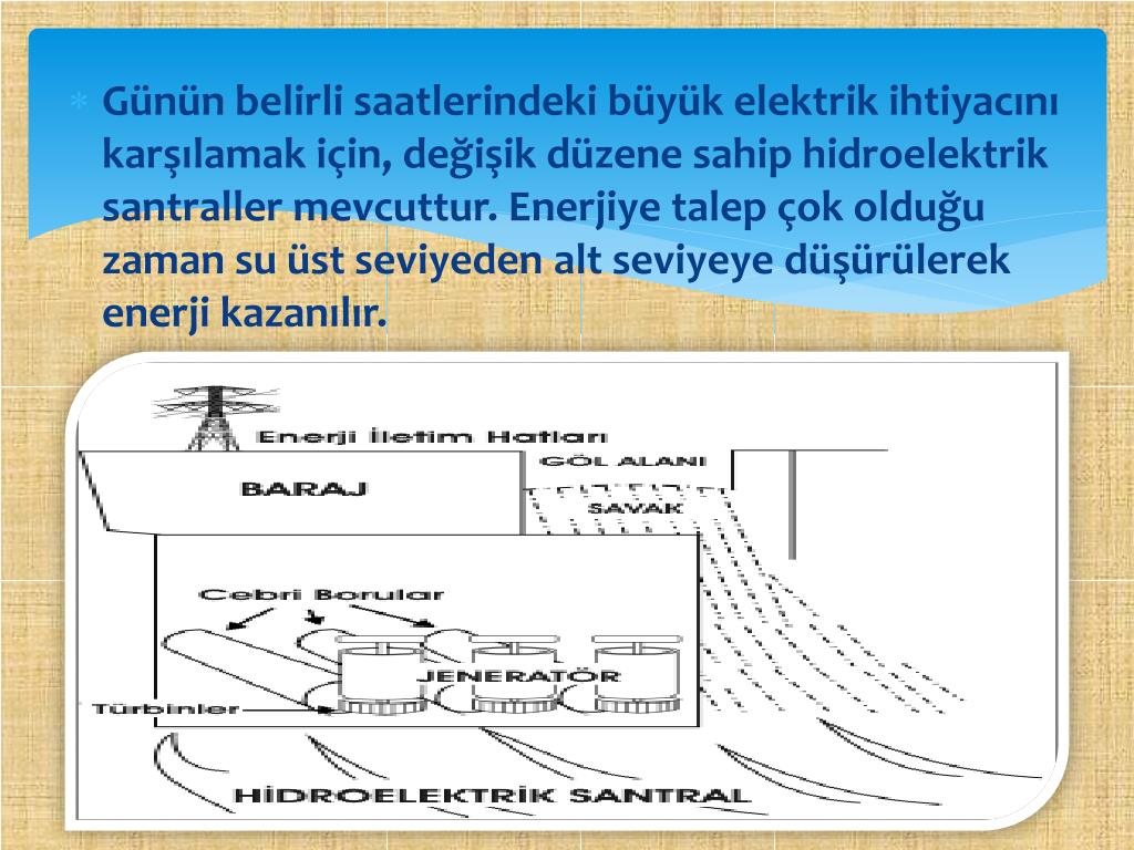 Günün belirli saatlerindeki büyük elektrik ihtiyacını karşılamak için, değişik düzene sahip hidroelektrik santraller mevcuttur. Enerjiye talep çok olduğu zaman su üst seviyeden alt seviyeye düşürülerek enerji kazanılır.