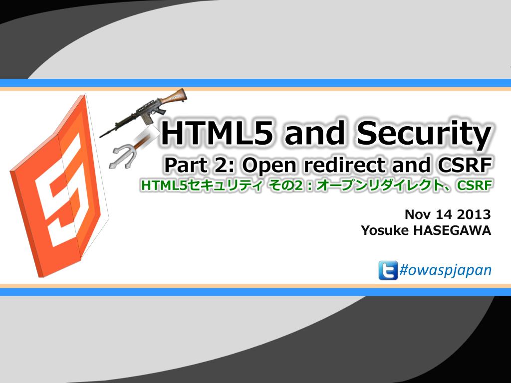 HTML5 and Security Part 2: Open redirect and CSRF HTML5 セキュリティ その 2 : オープン リダイレクト 、 CSRF. Nov 14 2013 Yosuke HASEGAWA. # owaspjapan. 自己紹介. はせがわようすけ ネットエージェント株式会社 株式会社セキュアスカイ・テクノロジー 技術顧問 Microsoft MVP for Consumer Security Oct 2005 - http://utf-8.jp/. お知らせ announcement.