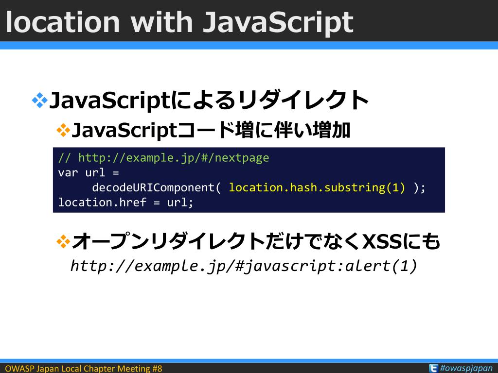 location with JavaScript • JavaScriptによるリダイレクト • JavaScriptコード増に伴い増加 • オープンリダイレクトだけでなくXSSにもhttp://example.jp/#javascript:alert(1) // http://example.jp/#/nextpage varurl=decodeURIComponent( location.hash.substring(1) ); location.href = url;