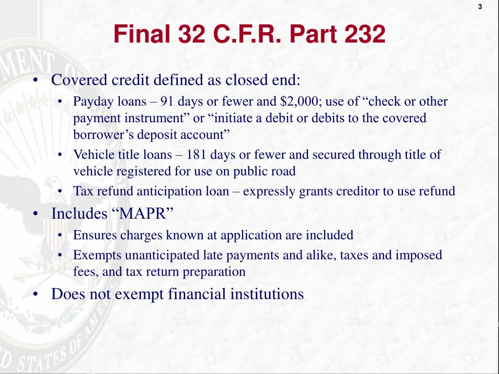 Final 32 C.F.R. Part 232 • Covered credit defined as closed end: • Payday loans – 91 days or fewer and $2,000; use of “check or other payment instrument” or “initiate a debit or debits to the covered borrower’s deposit account” • Vehicle title loans – 181 days or fewer and secured through title of vehicle registered for use on public road • Tax refund anticipation loan – expressly grants creditor to use refund • Includes “MAPR” • Ensures charges known at application are included • Exempts unanticipated late payments and alike, taxes and imposed fees, and tax return preparation • Does not exempt financial institutions