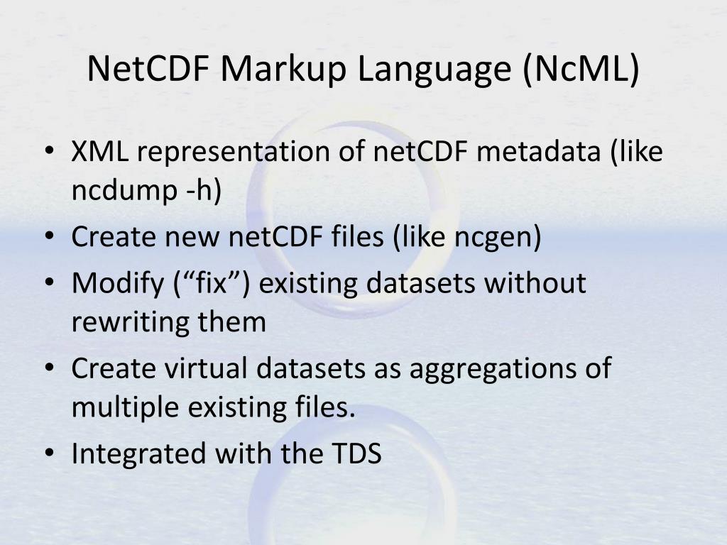 NetCDF Markup Language (NcML) XML representation of netCDF metadata (like ncdump -h) Create new netCDF files (like ncgen) Modify (“fix”) existing datasets without rewriting them Create virtual datasets as aggregations of multiple existing files. Integrated with the TDS