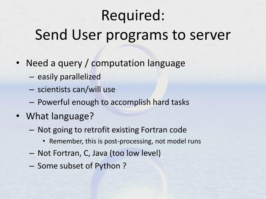 Required: Send User programs to server • Need a query / computation language • easily parallelized • scientists can/will use • Powerful enough to accomplish hard tasks • What language? • Not going to retrofit existing Fortran code • Remember, this is post-processing, not model runs • Not Fortran, C, Java (too low level) • Some subset of Python ?