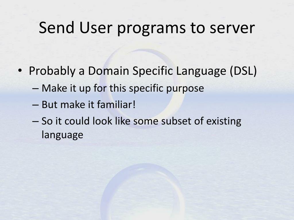 Send User programs to server • Probably a Domain Specific Language (DSL) • Make it up for this specific purpose • But make it familiar! • So it could look like some subset of existing language