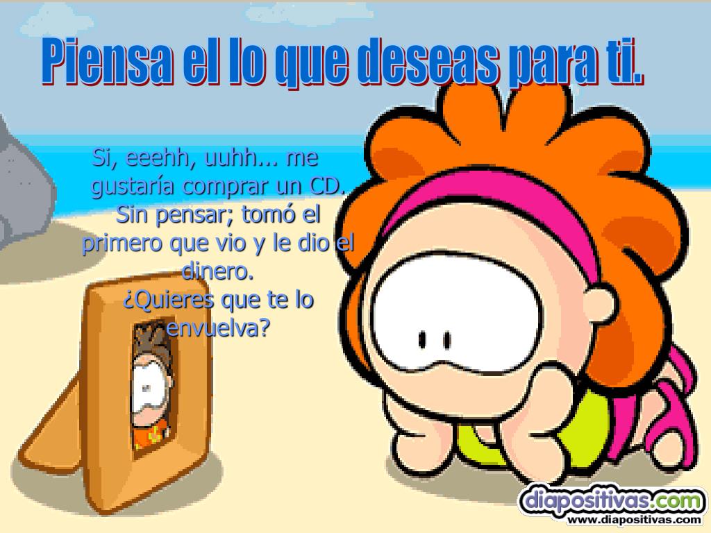 Piensa el lo que deseas para ti. Si, eeehh, uuhh... me gustaría comprar un CD.Sin pensar; tomó el primero que vio y le dio el dinero.¿Quieres que te lo envuelva?