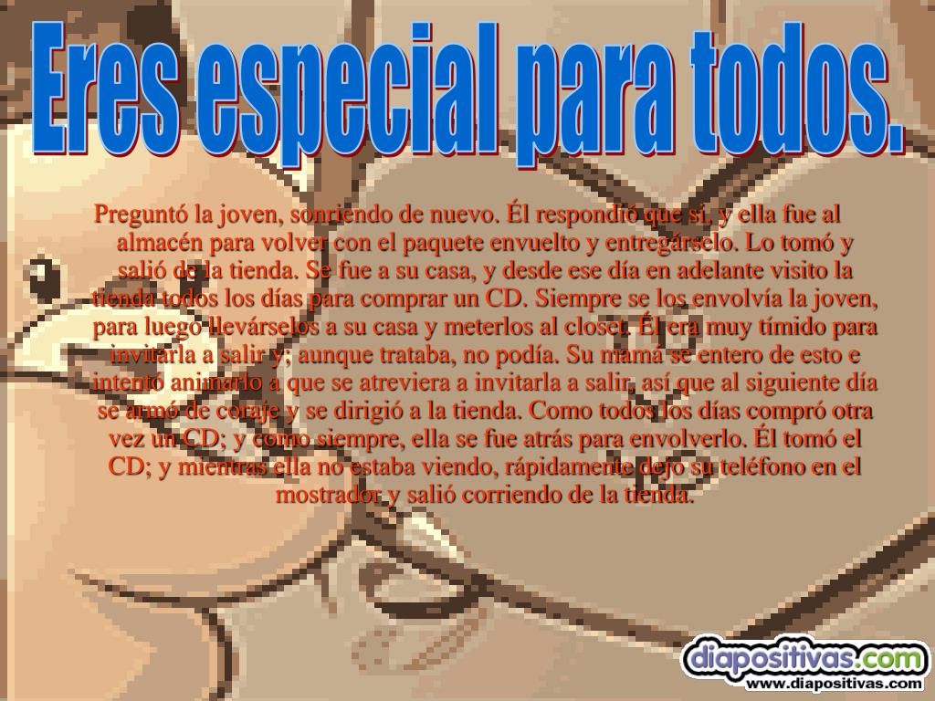 Eres especial para todos. Preguntó la joven, sonriendo de nuevo. Él respondió que si, y ella fue al almacén para volver con el paquete envuelto y entregárselo. Lo tomó y salió de la tienda. Se fue a su casa, y desde ese día en adelante visito la tienda todos los días para comprar un CD. Siempre se los envolvía la joven, para luego llevárselos a su casa y meterlos al closet. Él era muy tímido para invitarla a salir y; aunque trataba, no podía. Su mamá se entero de esto e intentó animarlo a que se atreviera a invitarla a salir, así que al siguiente día se armó de coraje y se dirigió a la tienda. Como todos los días compró otra vez un CD; y como siempre, ella se fue atrás para envolverlo. Él tomó el CD; y mientras ella no estaba viendo, rápidamente dejo su teléfono en el mostrador y salió corriendo de la tienda.