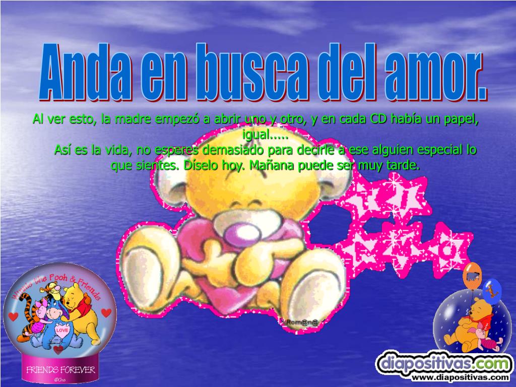 Anda en busca del amor. Al ver esto, la madre empezó a abrir uno y otro, y en cada CD había un papel, igual.....Así es la vida, no esperes demasiado para decirle a ese alguien especial lo que sientes. Díselo hoy. Mañana puede ser muy tarde.