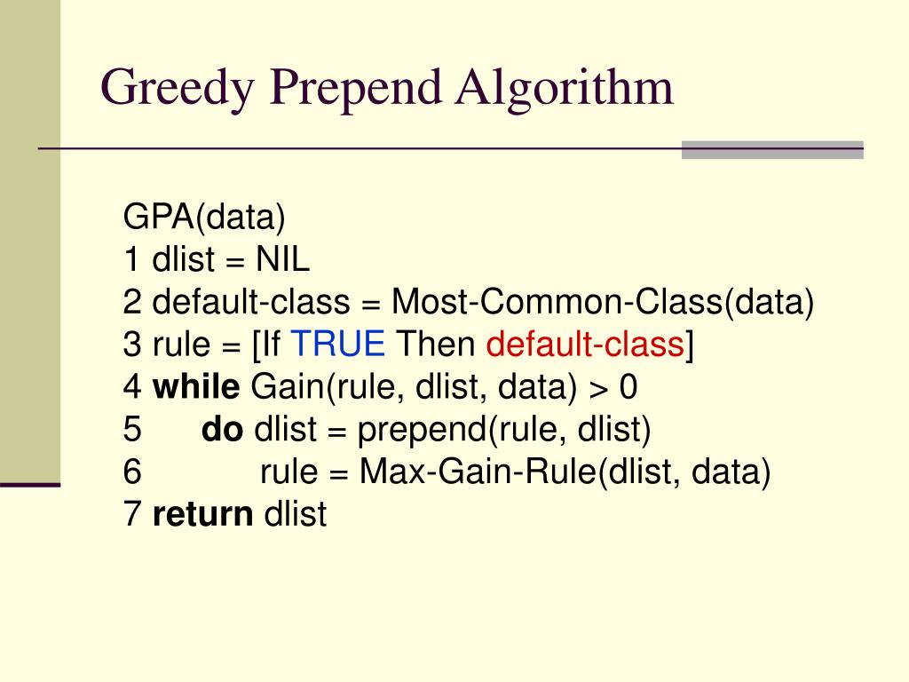 Greedy Prepend Algorithm GPA(data) 1 dlist = NIL 2 default-class = Most-Common-Class(data) 3 rule = [If TRUE Then default-class] 4 while Gain(rule, dlist, data) > 0 5 do dlist = prepend(rule, dlist) 6 rule = Max-Gain-Rule(dlist, data) 7 return dlist