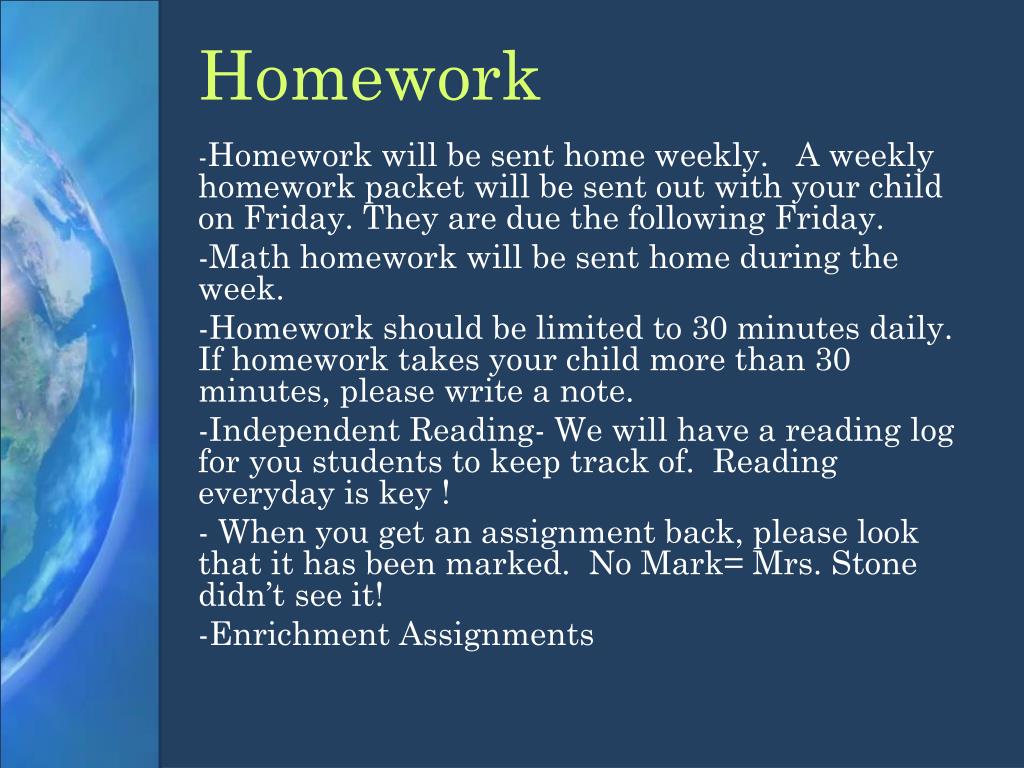 Homework • -Homework will be sent home weekly. A weekly homework packet will be sent out with your child on Friday. They are due the following Friday. • -Math homework will be sent home during the week. • -Homework should be limited to 30 minutes daily. If homework takes your child more than 30 minutes, please write a note. • -Independent Reading- We will have a reading log for you students to keep track of. Reading everyday is key ! • - When you get an assignment back, please look that it has been marked. No Mark= Mrs. Stone didn’t see it! • -Enrichment Assignments