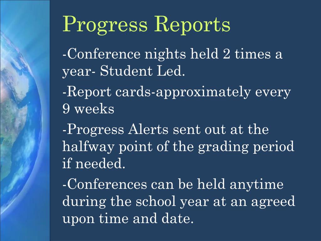 Progress Reports • -Conference nights held 2 times a year- Student Led. • -Report cards-approximately every 9 weeks • -Progress Alerts sent out at the halfway point of the grading period if needed. • -Conferences can be held anytime during the school year at an agreed upon time and date.