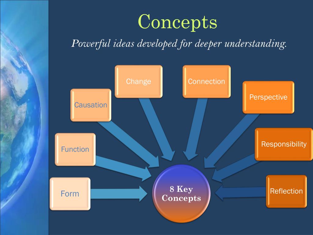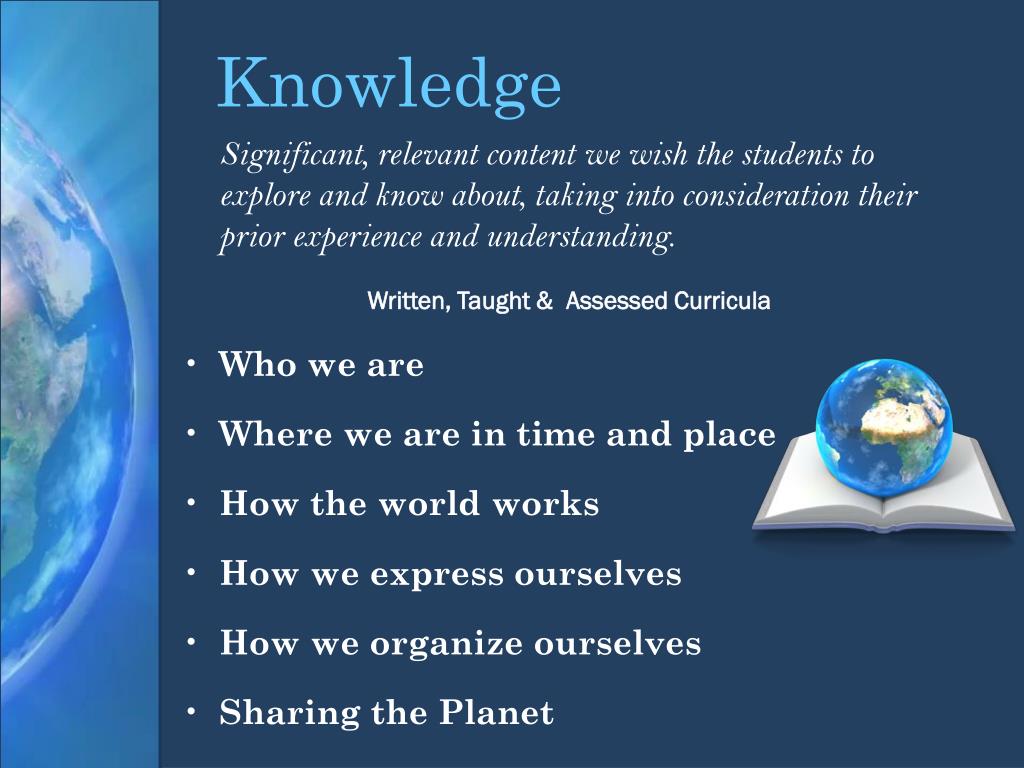 Knowledge • Significant, relevant content we wish the students to explore and know about, taking into consideration their prior experience and understanding. • Written, Taught & Assessed Curricula • Who we are • Where we are in time and place • How the world works • How we express ourselves • How we organize ourselves • Sharing the Planet