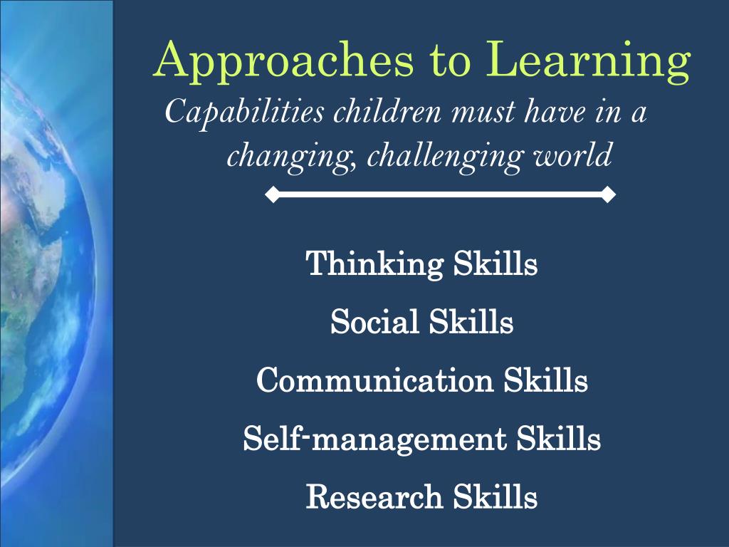 Approaches to Learning • Capabilities children must have in a changing, challenging world • Thinking Skills • Social Skills • Communication Skills • Self-management Skills • Research Skills
