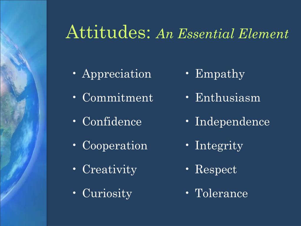 Attitudes: An Essential Element • Appreciation • Commitment • Confidence • Cooperation • Creativity • Curiosity • Empathy • Enthusiasm • Independence • Integrity • Respect • Tolerance