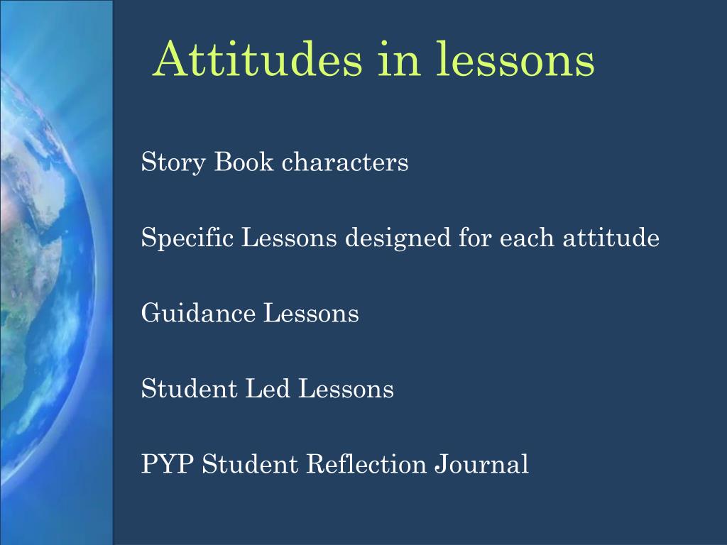 Story Book characters Specific Lessons designed for each attitude Guidance Lessons Student Led Lessons PYP Student Reflection Journal Attitudes in lessons