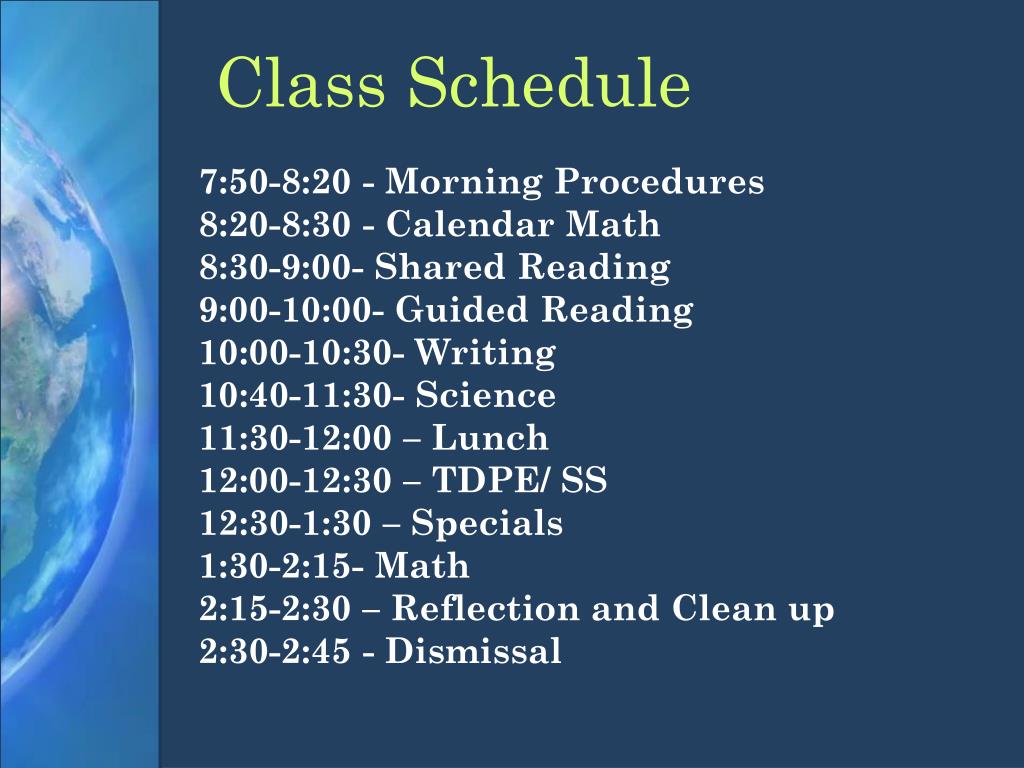 7:50-8:20 - Morning Procedures 8:20-8:30 - Calendar Math 8:30-9:00- Shared Reading 9:00-10:00- Guided Reading 10:00-10:30- Writing 10:40-11:30- Science 11:30-12:00 – Lunch 12:00-12:30 – TDPE/ SS 12:30-1:30 – Specials 1:30-2:15- Math 2:15-2:30 – Reflection and Clean up 2:30-2:45 - Dismissal Class Schedule