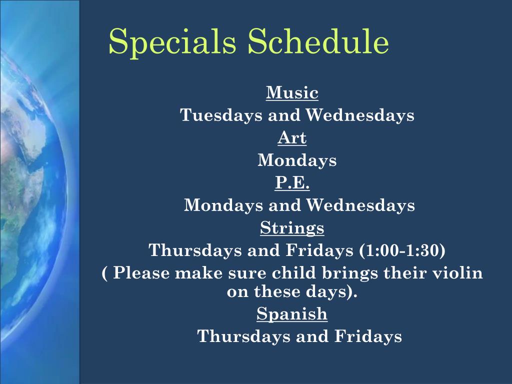 Music Tuesdays and Wednesdays Art Mondays P.E. Mondays and Wednesdays Strings Thursdays and Fridays (1:00-1:30) ( Please make sure child brings their violin on these days). Spanish Thursdays and Fridays Specials Schedule