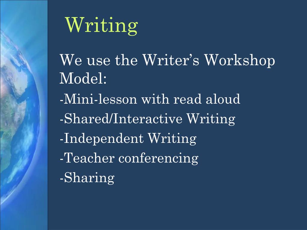We use the Writer’s Workshop Model: -Mini-lesson with read aloud -Shared/Interactive Writing -Independent Writing -Teacher conferencing -Sharing Writing