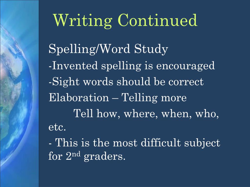Spelling/Word Study -Invented spelling is encouraged -Sight words should be correct Elaboration – Telling more Tell how, where, when, who, etc. - This is the most difficult subject for 2nd graders. Writing Continued
