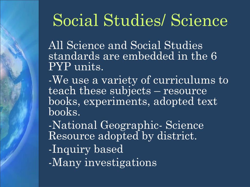 All Science and Social Studies standards are embedded in the 6 PYP units. -We use a variety of curriculums to teach these subjects – resource books, experiments, adopted text books. -National Geographic- Science Resource adopted by district. -Inquiry based -Many investigations Social Studies/ Science