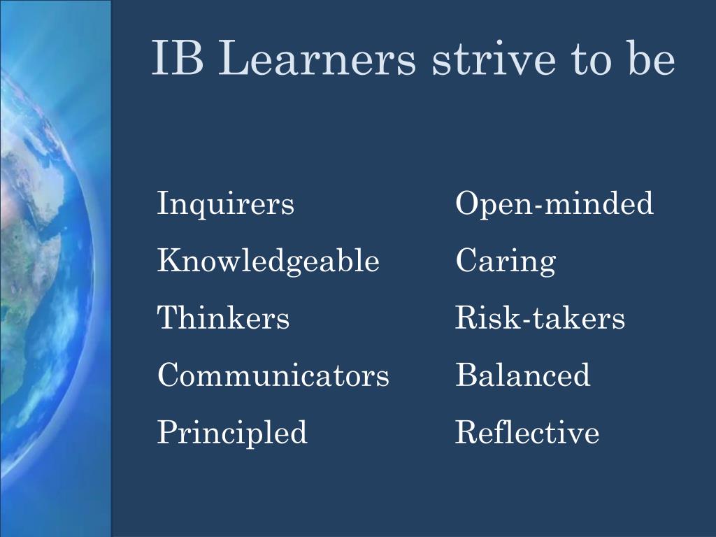 IB Learners strive to be Inquirers Knowledgeable Thinkers Communicators Principled Open-minded Caring Risk-takers Balanced Reflective