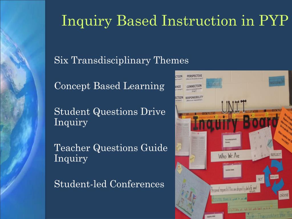 Six Transdisciplinary Themes Concept Based Learning Student Questions Drive Inquiry Teacher Questions Guide Inquiry Student-led Conferences Inquiry Based Instruction in PYP