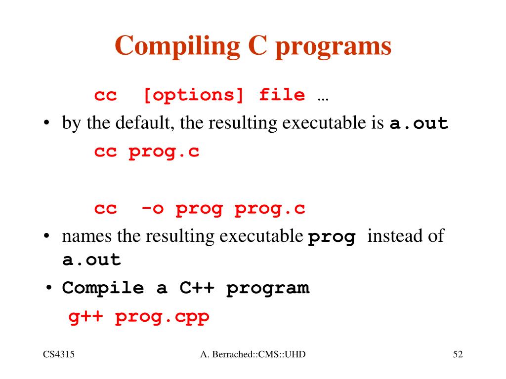Compiling C programs cc [options] file … • by the default, the resulting executable is a.out cc prog.c cc -o prog prog.c • names the resulting executable prog instead of a.out • Compile a C++ program g++ prog.cpp A. Berrached::CMS::UHD