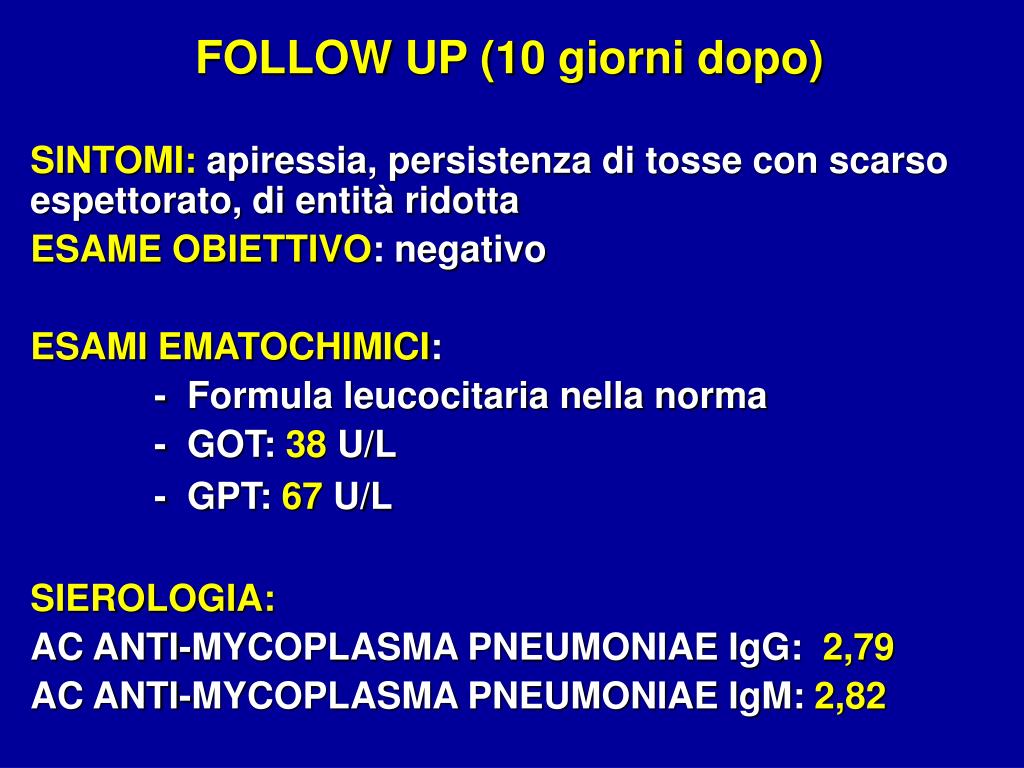 FOLLOW UP (10 giorni dopo) SINTOMI: apiressia, persistenza di tosse con scarso espettorato, di entità ridotta ESAME OBIETTIVO: negativo ESAMI EMATOCHIMICI: - Formula leucocitaria nella norma - GOT: 38 U/L - GPT: 67 U/L SIEROLOGIA: AC ANTI-MYCOPLASMA PNEUMONIAE IgG: 2,79 AC ANTI-MYCOPLASMA PNEUMONIAE IgM: 2,82