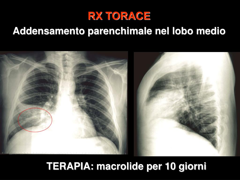 RX TORACE Addensamento parenchimale nel lobo medio TERAPIA:macrolide per 10 giorni