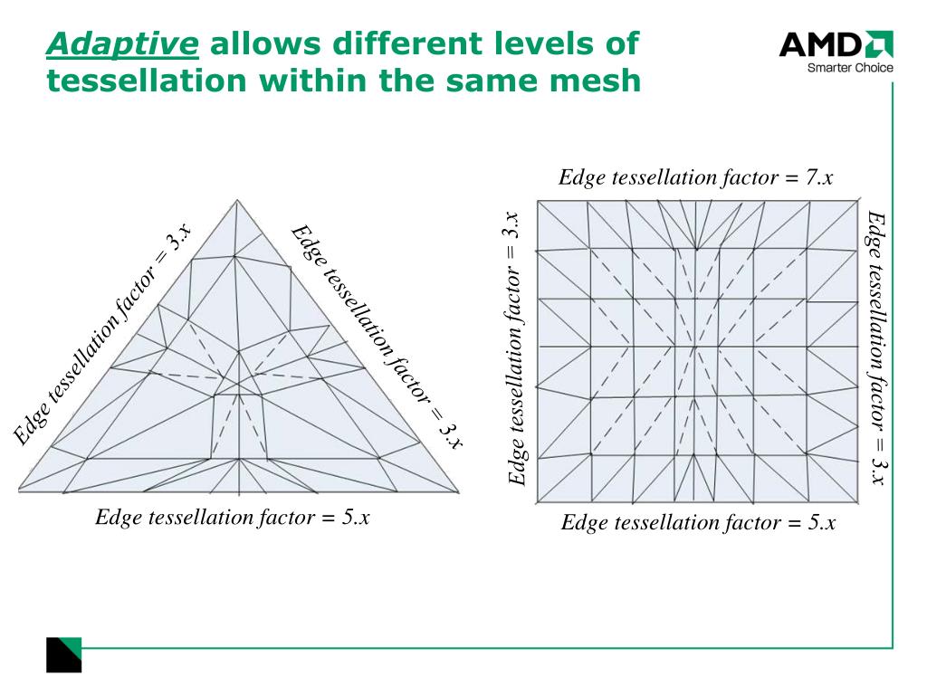 Edge tessellation factor = 7.x Edge tessellation factor = 3.x Edge tessellation factor = 3.x Edge tessellation factor = 3.x Edge tessellation factor = 3.x Edge tessellation factor = 5.x Edge tessellation factor = 5.x Adaptive allows different levels of tessellation within the same mesh